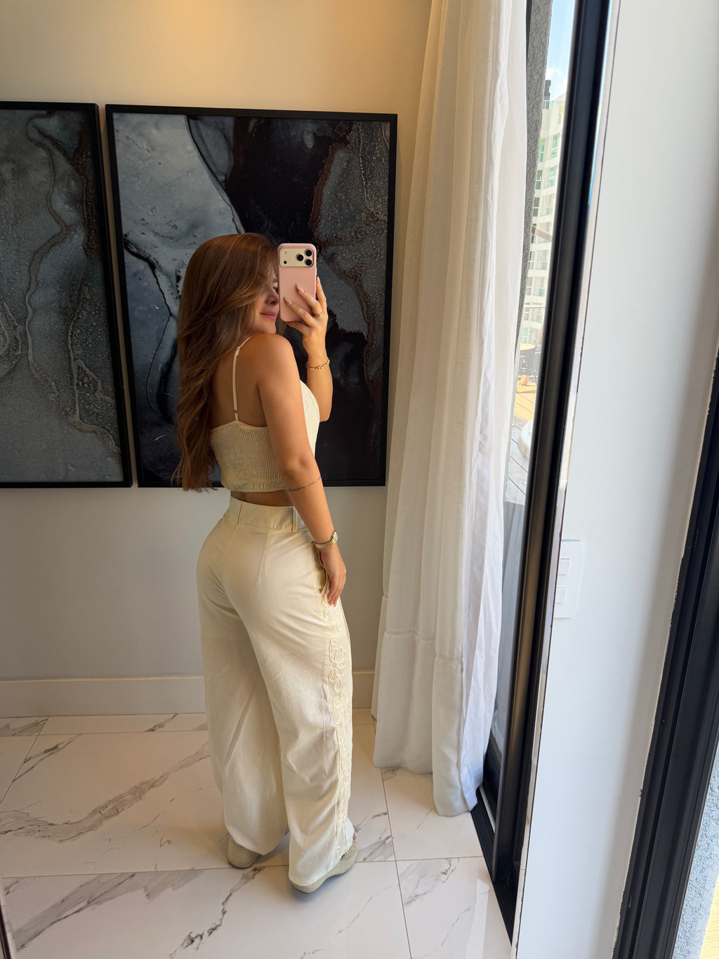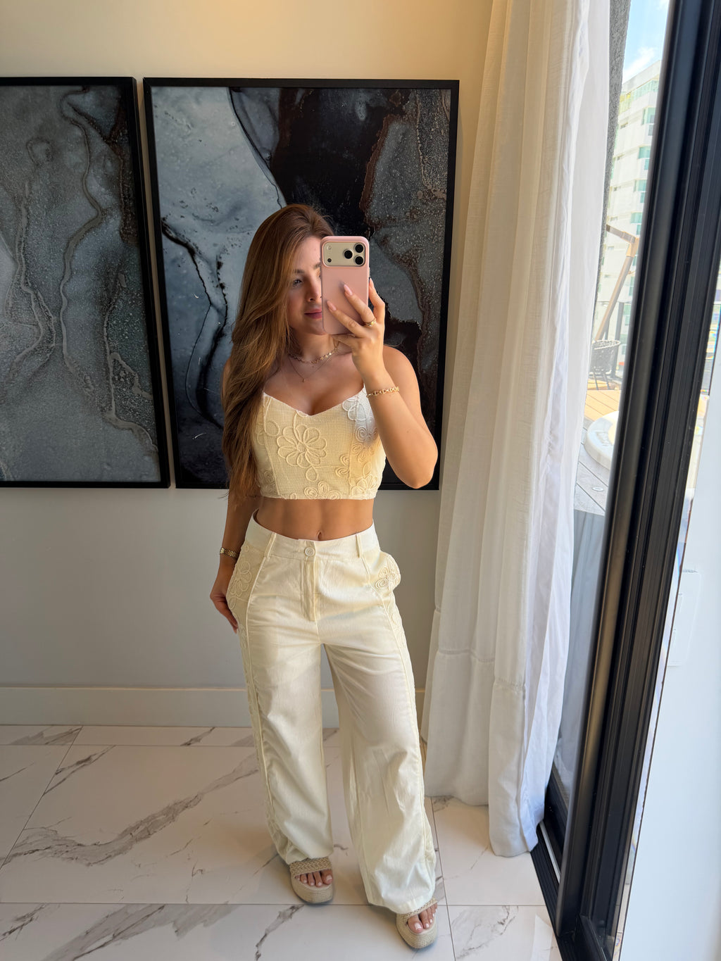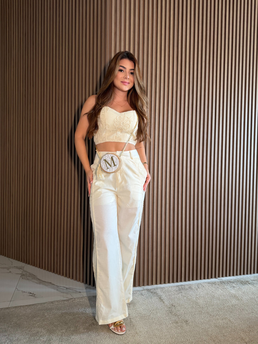O top possui alças finas e acabamento delicado, enquanto a calça traz cintura média/alta, oferecendo elegância e versatilidade para diversas ocasiões — de almoços especiais a viagens, beach clubs e eventos ao ar livre.