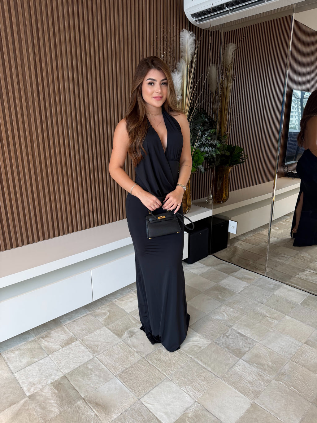 Com decote halter profundo, tecido drapeado no busto e costas totalmente abertas, a peça valoriza a silhueta com sofisticação e equilíbrio perfeito. A modelagem ajustada acompanha o corpo de forma elegante, enquanto a fenda posterior garante movimento e um toque extra de charme.