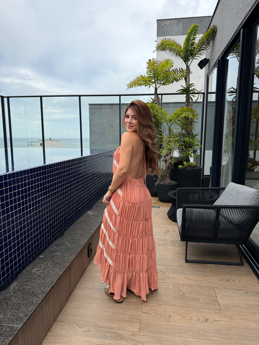 O Vestido Coral Riviera é a definição de elegância leve com toque resort chic. Com design fluido, recortes delicados em renda e costas abertas, ele foi criado para mulheres que desejam marcar presença com sofisticação e naturalidade.
